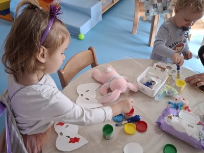 Djeca jasličke skupine “Loptice” upisana su u novouređeni prostor našeg vrtića, na Trgu mladosti 9, u veljači 2025. godine. Kako bi proces prilagodbe prošao što uspješnije provodile su se aktivnosti kao što su: pjevanje pjesmica, brojalica, igre sa prstićima, čitanje slikovnica, oponašanje glasanja i kretanja životinja, istraživanje domaćeg plastelina i modeliranje istog, manipuliranje raznim vizualno-taktilnim pločama i dr. Period prilagodbe prošao je uspješno te su se djeca vrlo brzo osjećala sigurno i prihvaćeno. Prostor je obogaćen prirodnim neoblikovanim materijalima, kao i raznim taktilno-senzornim poticajima koji potiču cjelokupni razvoj djeteta.
